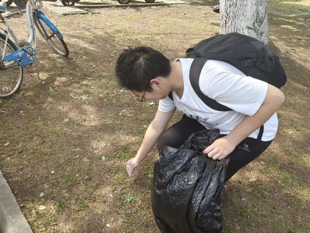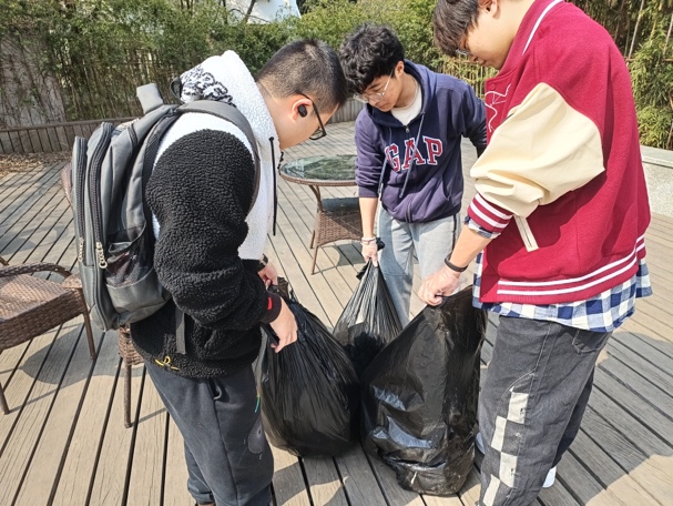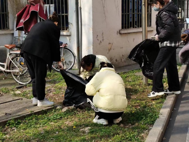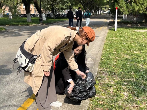 宣讲结束后,同学们分成四组,提上垃圾袋、戴上手套,前往校园中垃圾相对较多的地方如东校区教育超市周围、东吴桥附近等地进行清扫。不仅将马路边的包装袋、纸屑、落叶等清理干净,同学们也细心地将灌木丛、水泥路缝隙等细微处的垃圾清扫出来,之后利用在讲座中学习到的相关知识将这些垃圾正确分类,并投放到各自属于的垃圾堆中。同学们合理分工、相互配合,积极参与志愿服务,齐心协力之下圆满地完成了本次打扫校园的志愿活动。