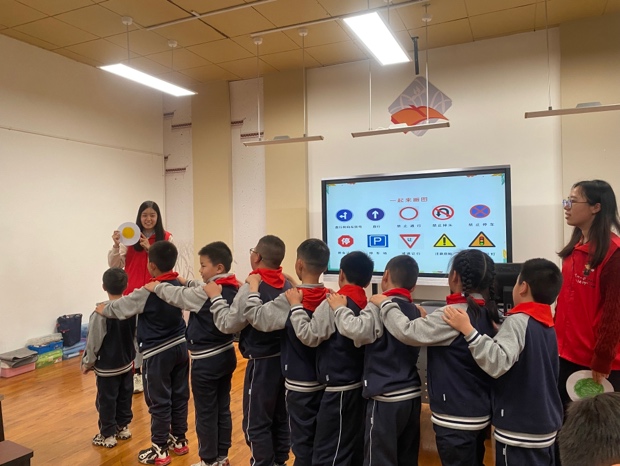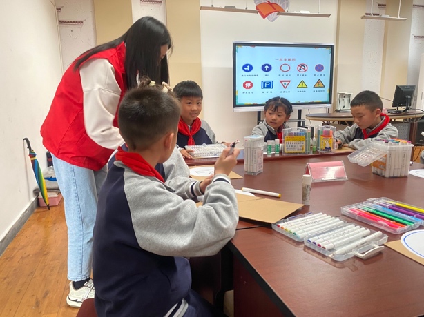 在留园中心小学校的普法活动中,公益团紧扣小学生心理生理特征,聚焦青少年法治思维培育,着重在互动性上下功夫,将法治教育元素融入游戏项目,让学生们在“玩”中学法,法治宣传教育综合效应不断增强。首先,公益团联合交警同志向小朋友们讲解交通知识法规,小朋友们积极参与,课堂氛围十分活跃。讲解结束后,志愿者们带领小朋友绘制交通标志并进行了小游戏,小朋友担任司机,在志愿者出示交通标志时作出相应的反应,志愿者们还组织了交通知识抢答,小朋友们踊跃回答。