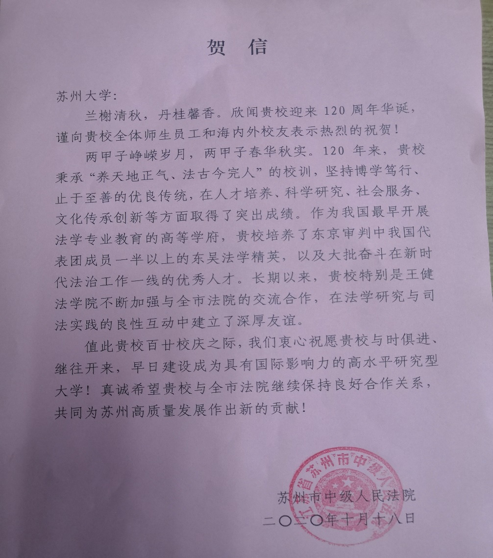 苏州市中级人民法院来院祝贺betway西汉姆联120周年校庆