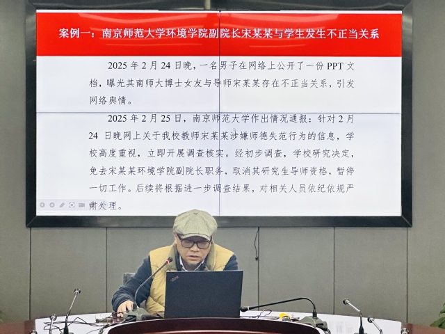 会议进入“以案为鉴”环节,通过剖析多起高校师德失范的真实案例,如南京师范大学环境学院副院长宋某某与学生发生不正当关系、复旦大学博士后王某学术不端问题,以及成都中医药大学教师赵某在网络平台发表不当言论等事件,将抽象的师德规范具体化、生动化。每一个案例都如同一面镜子,让在场的每位教师深刻反思,警醒自身要时刻严守职业道德,避免触碰红线。