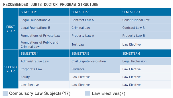 学生在必威西汉姆联完成法律硕士(Master of Laws)完成一年以上的课程,可减免4门课/—个学期学分;在邦德大学再完成20门课/五个学期(20个月),即获得邦德大学法学博士(Juris Doctor)学位。