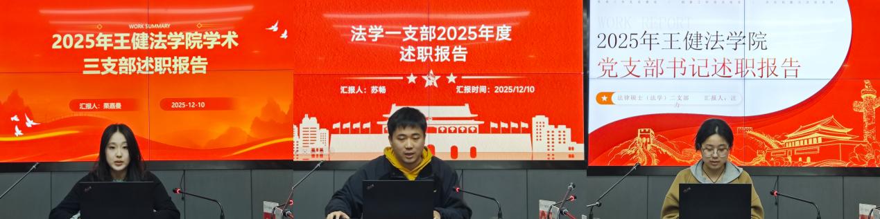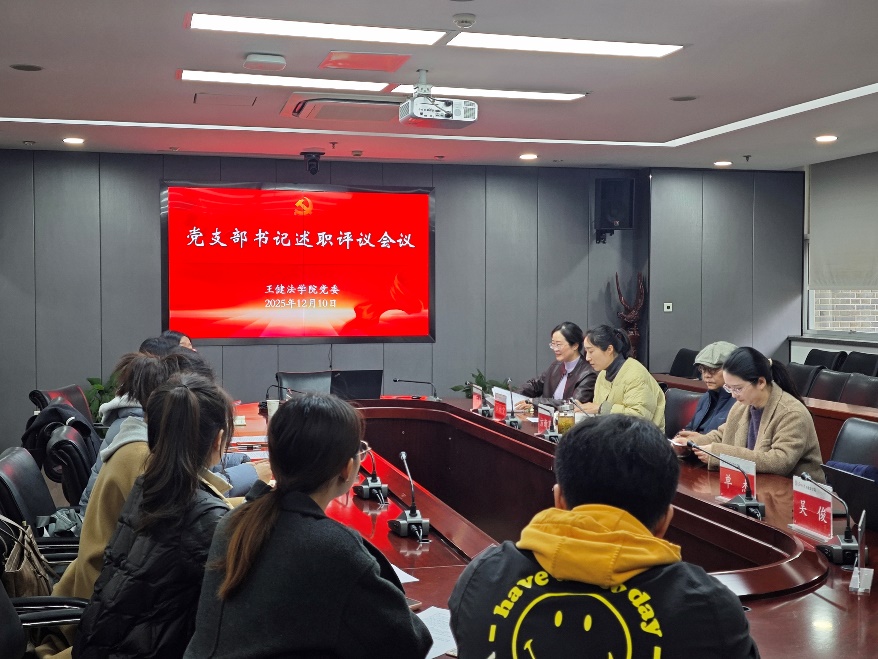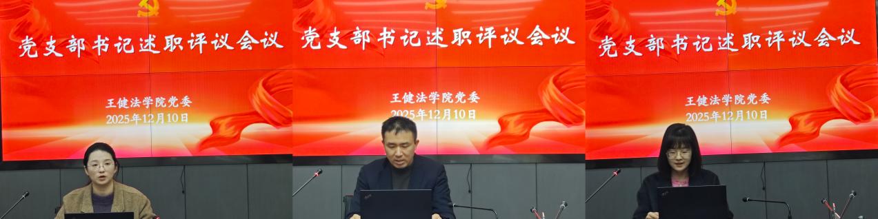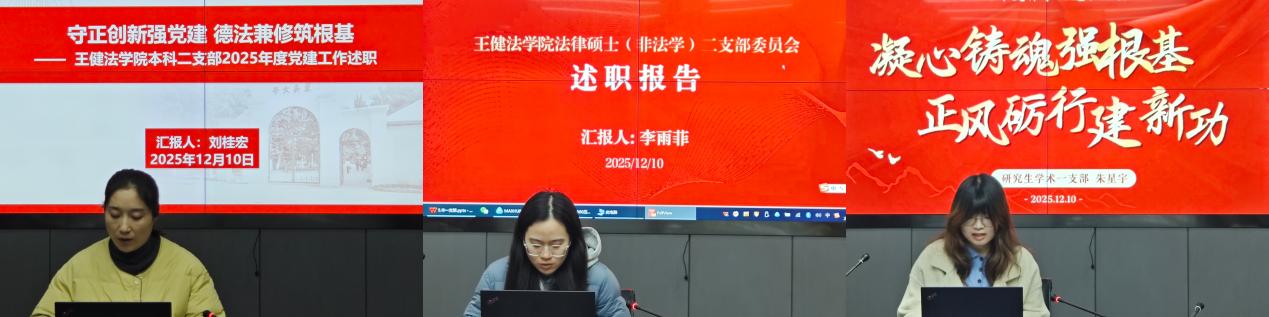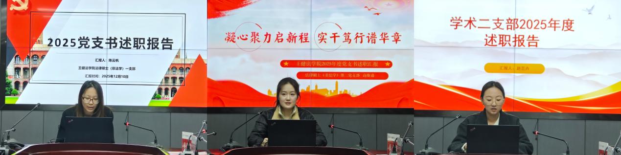 本二支部聚焦中华优秀传统文化与法学专业的创造性融合,探索党建引领下的文化育人新路径;学术一支部着力打造“理论学习、实践锻炼、服务社会”三位一体学习模式,推动党员管理精细化、活动载体创新化;法律硕士(法学)二支部则系统分享了党员教育管理规范化、教育机制健全化以及红色教育系列化的有效经验。各党支部的述职充分体现了党建工作在凝聚人心、推动发展、服务师生中的引领作用。