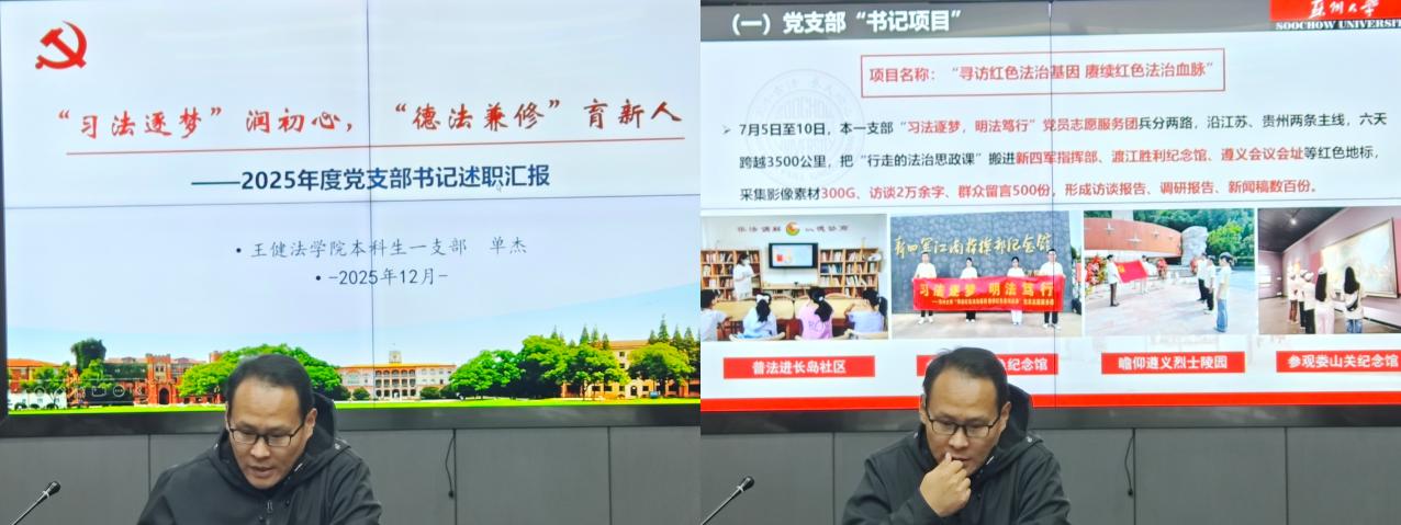 作为第四批“全国党建工作样板支部”,本一支部的述职报告格外引人注目。党支部书记单杰重点汇报了“寻访红色法治基因 赓续红色法治血脉”书记项目的丰硕成果。党支部党员志愿服务团兵分江苏、贵州两路,六天跨越3500公里,将“行走的法治思政课”带进新四军指挥部、渡江胜利纪念馆、遵义会议会址等红色圣地。实践中,团队采集影像素材300G,开展访谈2万余字,收集群众留言500份,形成访谈报告、调研报告、新闻稿等数百份,以扎实足迹探寻红色法治之源,用专业视角诠释法治精神传承。